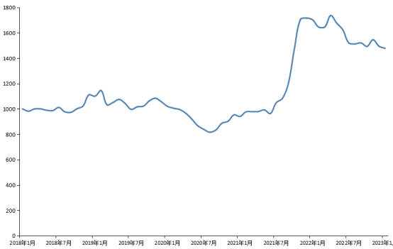 2月份,新华·中盐两碱工业盐价格指数报1442.96点,较上期(2023年1月)下跌34.50点,跌幅2.34%;较基期(2018年1月)上涨442.96点,涨幅44.30%;较周期内最高点1736.66点(2022年4月)下跌293.70点,跌幅16.91%;较周期内最低点816.2点(2020年8月)上涨626.76点,涨幅76.79%。
