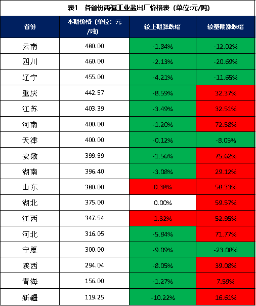 分价格区间来看,本期两碱工业盐单价在400-500元/吨之间的地区有7个,分别是云南、四川、辽宁、重庆、江苏、河南、天津;两碱工业盐单价在400元/吨以下的地区有10个,分别是安徽、湖南、山东、湖北、江西、河北、宁夏、陕西、青海、新疆。