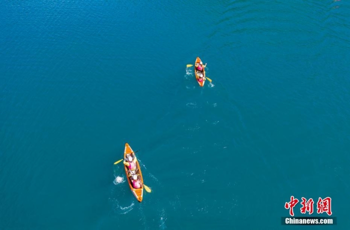 中新社林芝4月15日电 (记者 赵朗)15日早上10时许,哨声响起,8艘双人漂流艇极速前进,船桨拍打出水花,雪山映照蓝天,激烈角逐在巴松措上演。