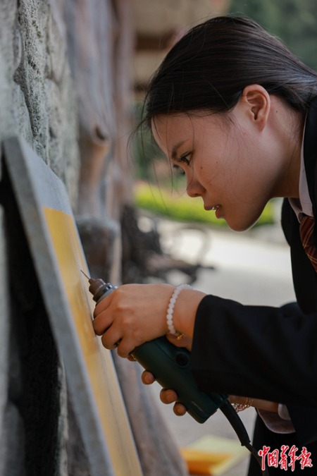 4月2日,谭春燕练习在石板上刻字。两三个月前她刚学会刻碑,现在已经很熟练。目前陵园已安葬80多位逝者,墓碑上的字基本都是陵园的几名员工亲手所刻。